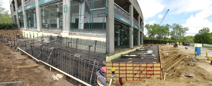 MSU originally requested that the columns for the scoreboard structures be reinforced concrete to match the stadium’s structure with independent caisson foundations. However, after bidding, the contractor proposed to build the columns with steel trusses and the north scoreboards with helical piers as a cost-saving measure. MSU accepted the cost-saving substitute, and we worked with the contractor to redesign the north scoreboard foundations and concrete columns.