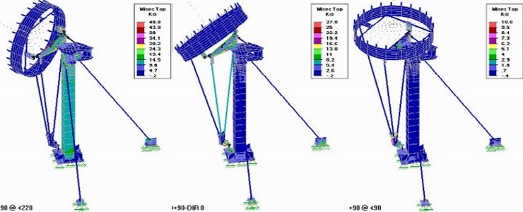 An initial analysis highlighted local areas of weakness within the structure, which SEE felt could be significantly strengthened with minor structural modifications. After consultation with our client, SEE was given the go-ahead to perform a redesign of these minor modifications for inclusion in the final analysis. Based upon this analysis, SEE compiled a substantial report which included graphical stress plots at each wind load case and operational position, pointing accuracy of the assembly under load, connection checks at critical points, and a typical foundation solution based on the provisions of TIA/EIA-222.